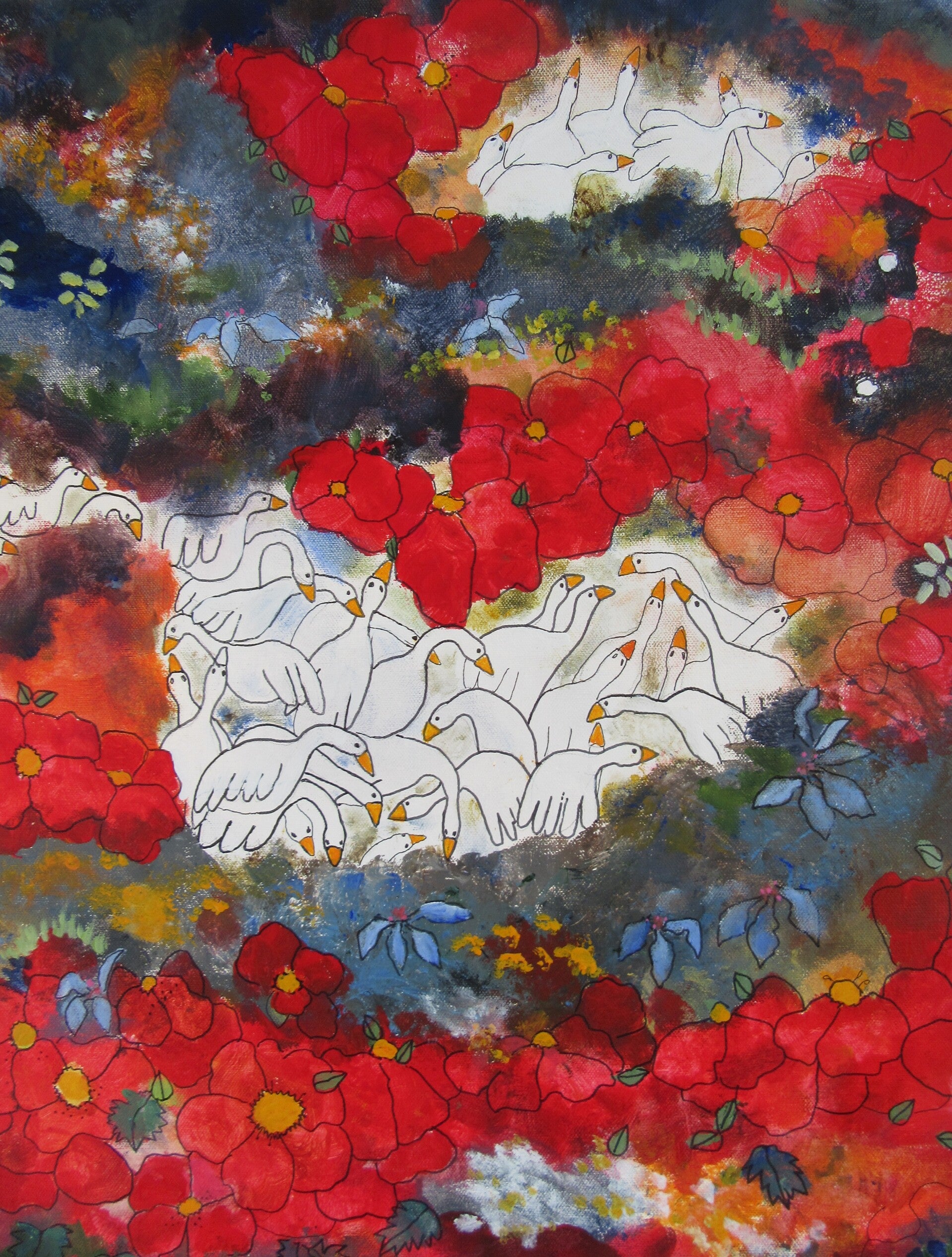 Mes tableaux naissent de taches de couleurs vibrantes et de jeux audacieux, où chaque coup de pinceau est une exploration. La couleur est ma priorité, cherchant à réaliser des harmonies intéressantes, parfois subtiles, parfois dérangeantes, mais toujours fidèles à l'instant présent. Je borde mes taches et mes dessins d'un trait foncé ou d'une ligne colorée, créant ainsi une nouvelle coloration, une image vibrante et particulière qui invite le regard.