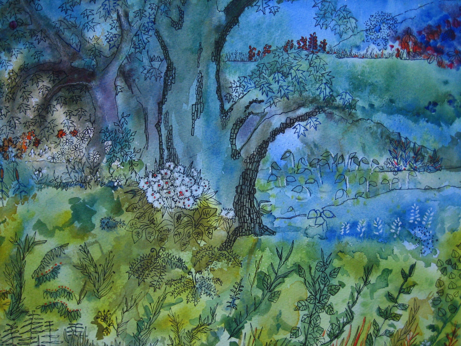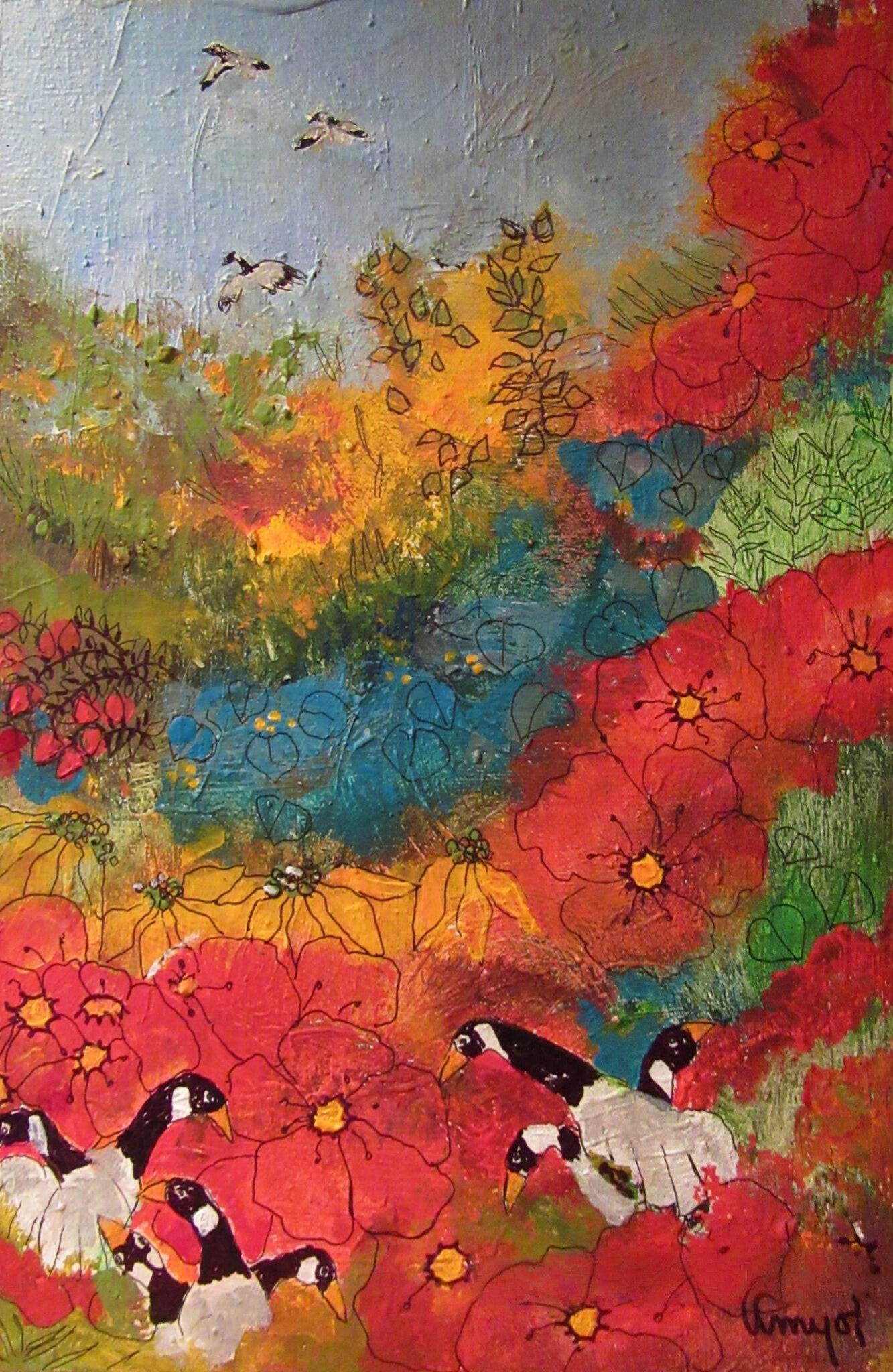 Prairie des oiseaux gouache, plume et feutre 18x14 (45cm x 35cm) (VENDU)